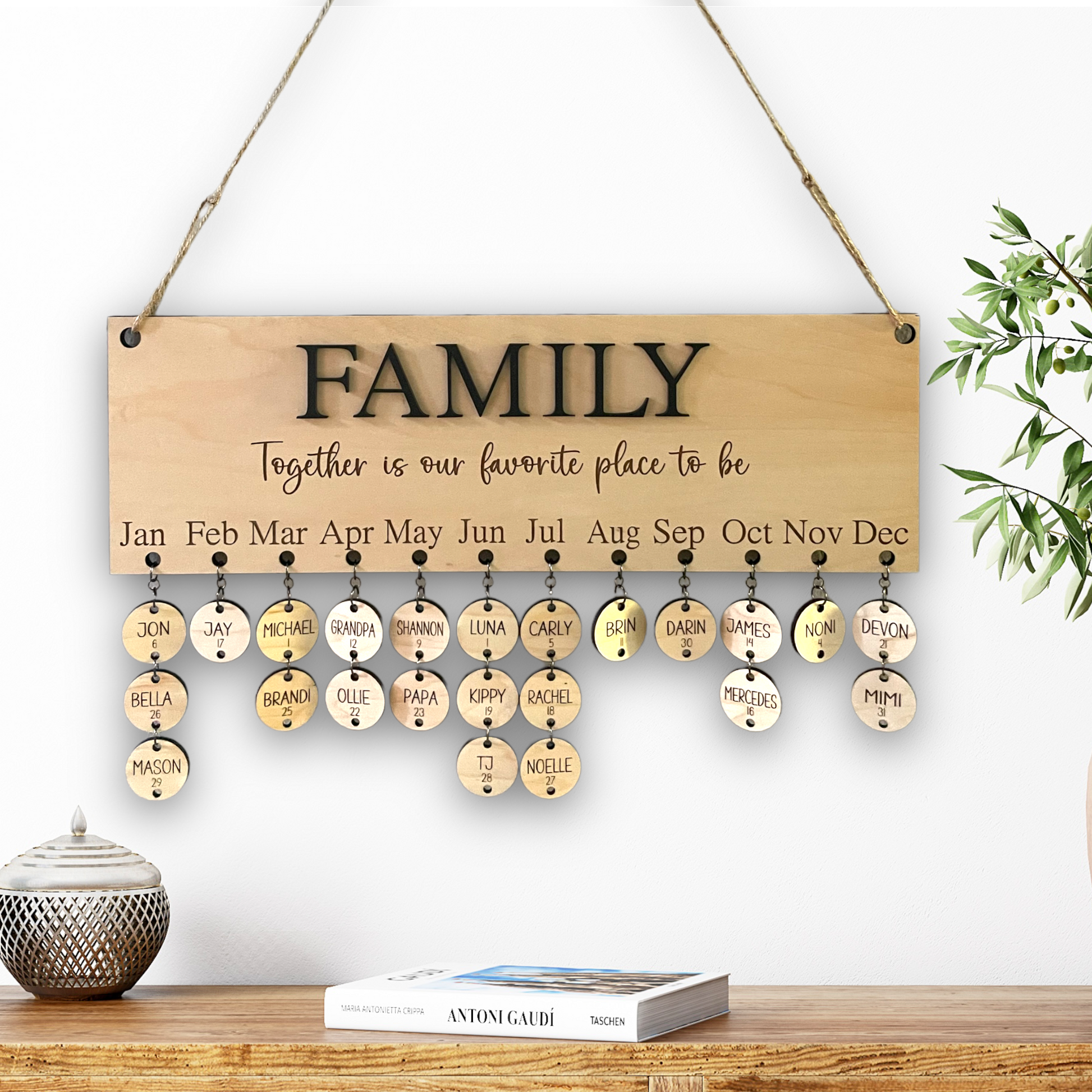 Measures approx. 16"x5"x1/2". Sign comes with 5 names/number engraved on circles. Each circle after that is additional cost.